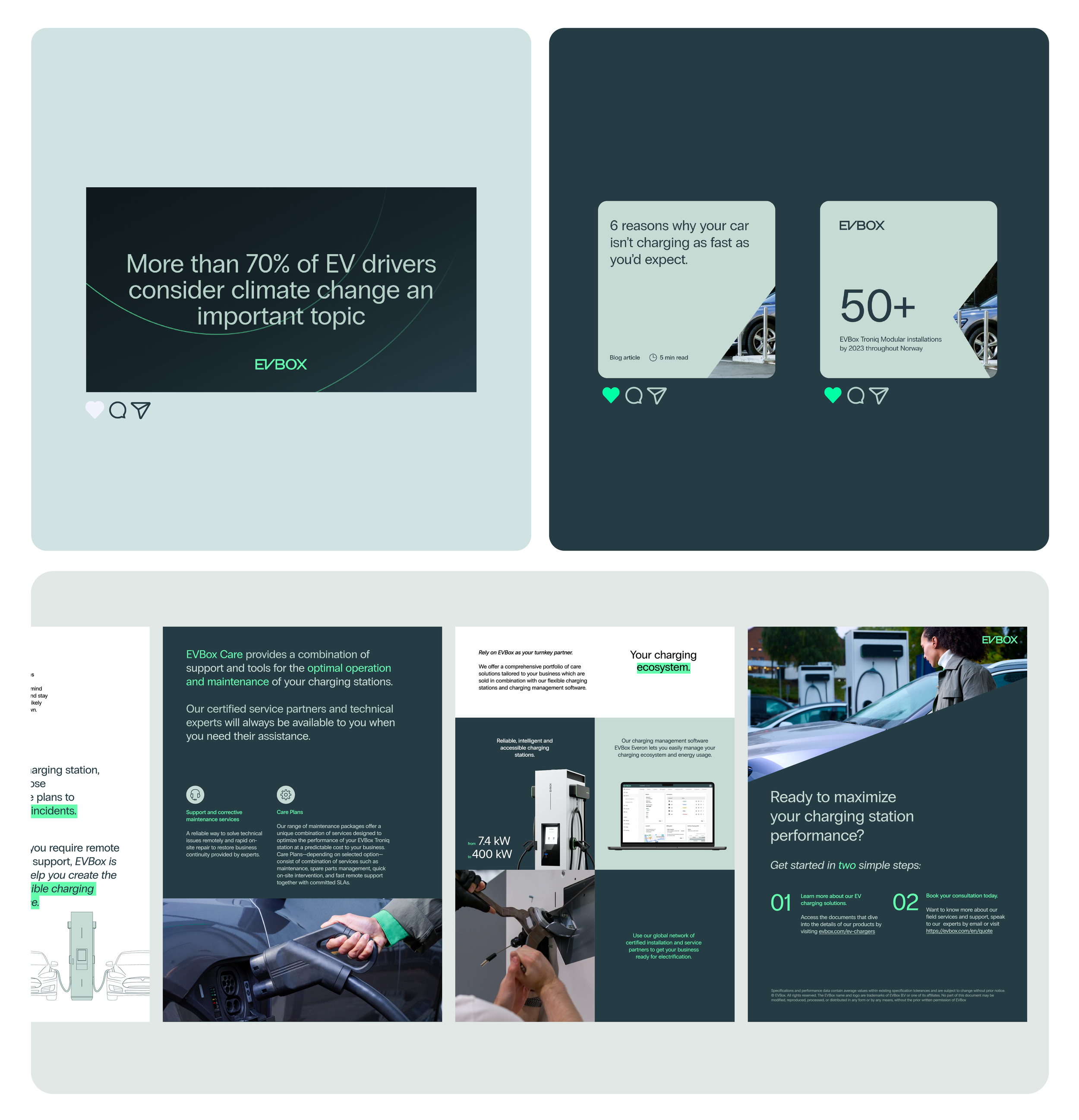 We started by identifying the contexts where EVBox's brand needed to perform: trade shows, digital marketing, sales presentations, internal communications, partner materials. Each had different requirements, different audiences, different constraints. But they all needed to feel unmistakably EVBox. The solution was a modular system paired with clear hierarchies and flexible layouts. Typography and color did the heavy lifting to maintain consistency, while layout templates gave their team structure without feeling restrictive.